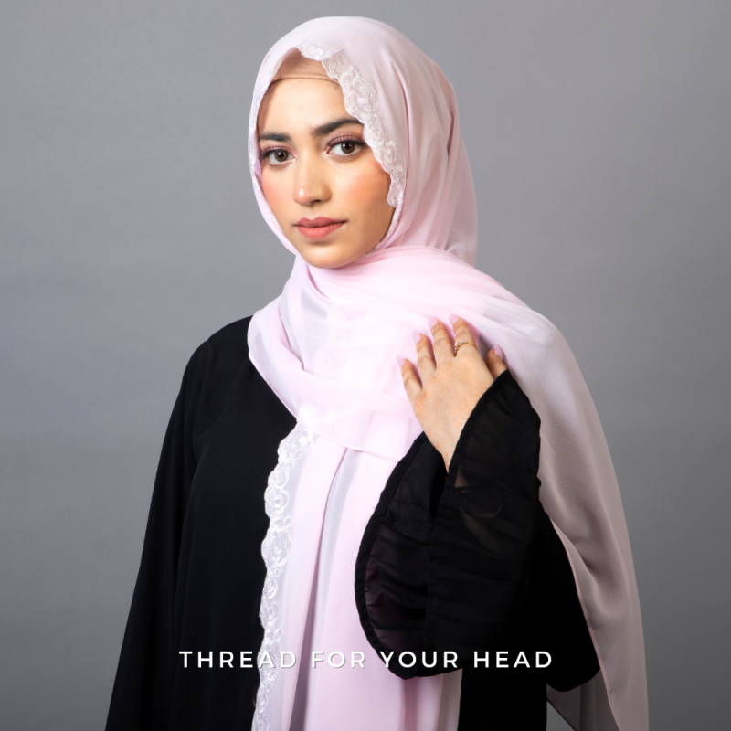 ROSETTE EMBROIDERY IS ON ONLY ONE SIDE OF THE HIJAB AT THE LONGER END